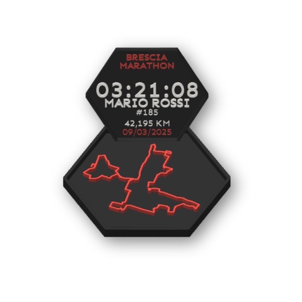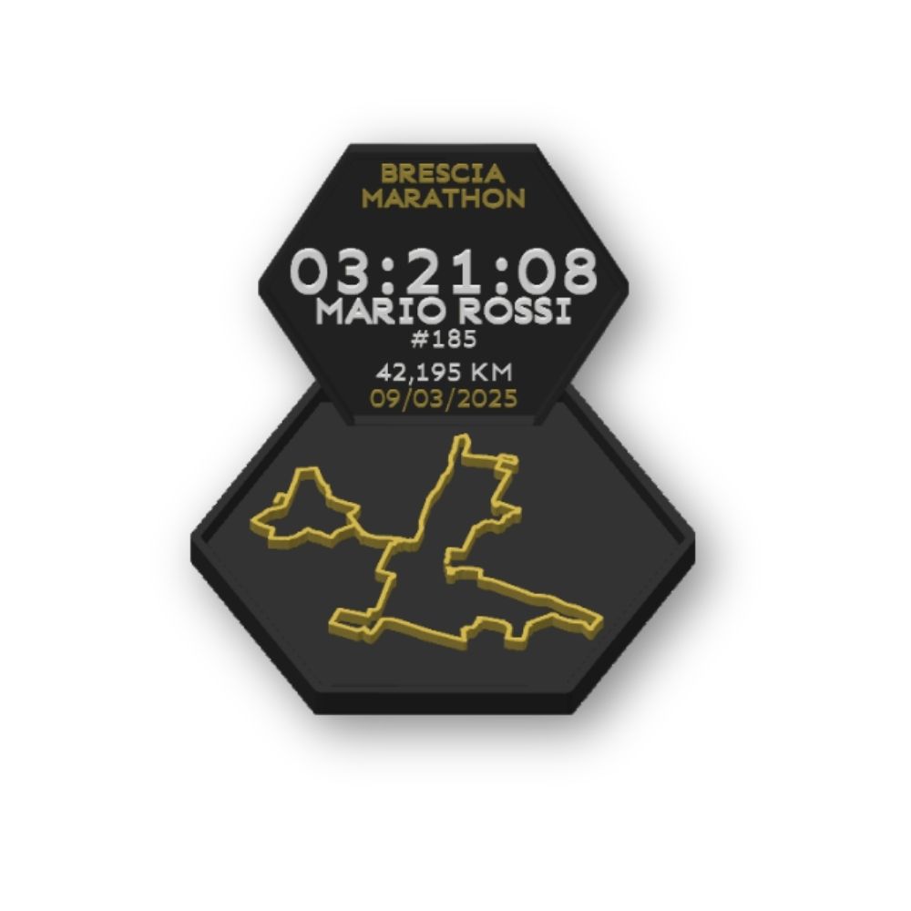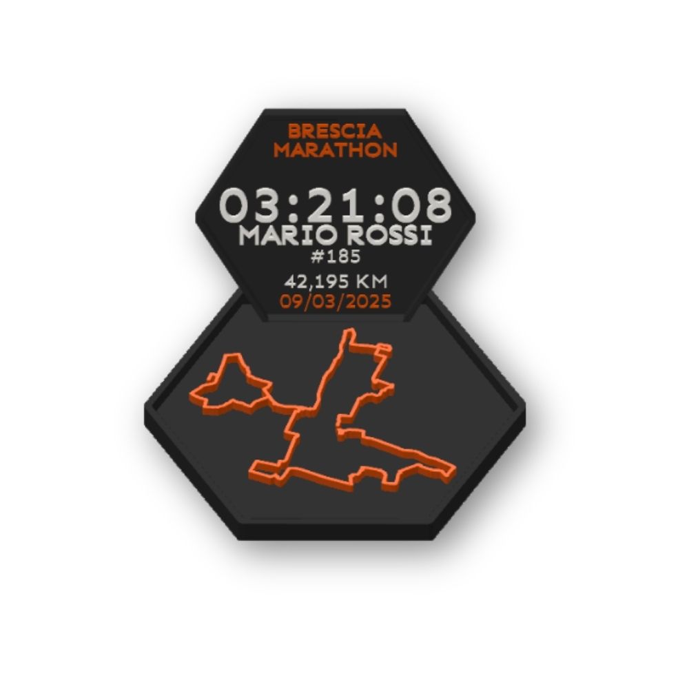 Un prodotto unico dedicato alla Maratona di Brescia, modellato e stampato in 3D, che trasforma il tuo percorso di gara in un oggetto di design da esporre con orgoglio. Sulla cornice vengono mostrati tempo finale, nome, numero di pettorale e data dell’evento, tutti personalizzabili dal runner.