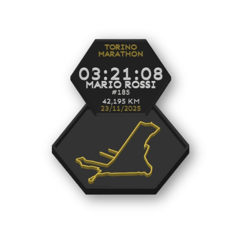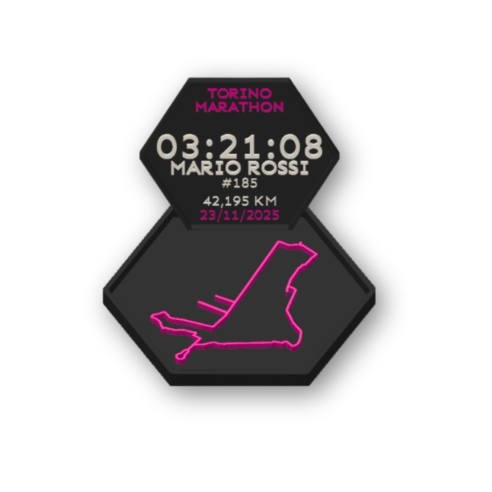 Un prodotto unico dedicato alla Maratona di Torino, modellato e stampato in 3D, che trasforma il tuo percorso di gara in un oggetto di design da esporre con orgoglio. Sulla cornice vengono mostrati tempo finale, nome, numero di pettorale e data dell’evento, tutti personalizzabili dal runner.