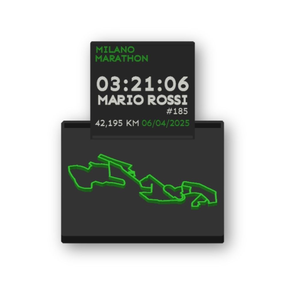 Un prodotto unico dedicato alla Maratona di MILANO, modellato e stampato in 3D, che trasforma il tuo percorso di gara in un oggetto di design da esporre con orgoglio. Sulla cornice vengono mostrati tempo finale, nome, numero di pettorale e data dell’evento, tutti personalizzabili dal runner.