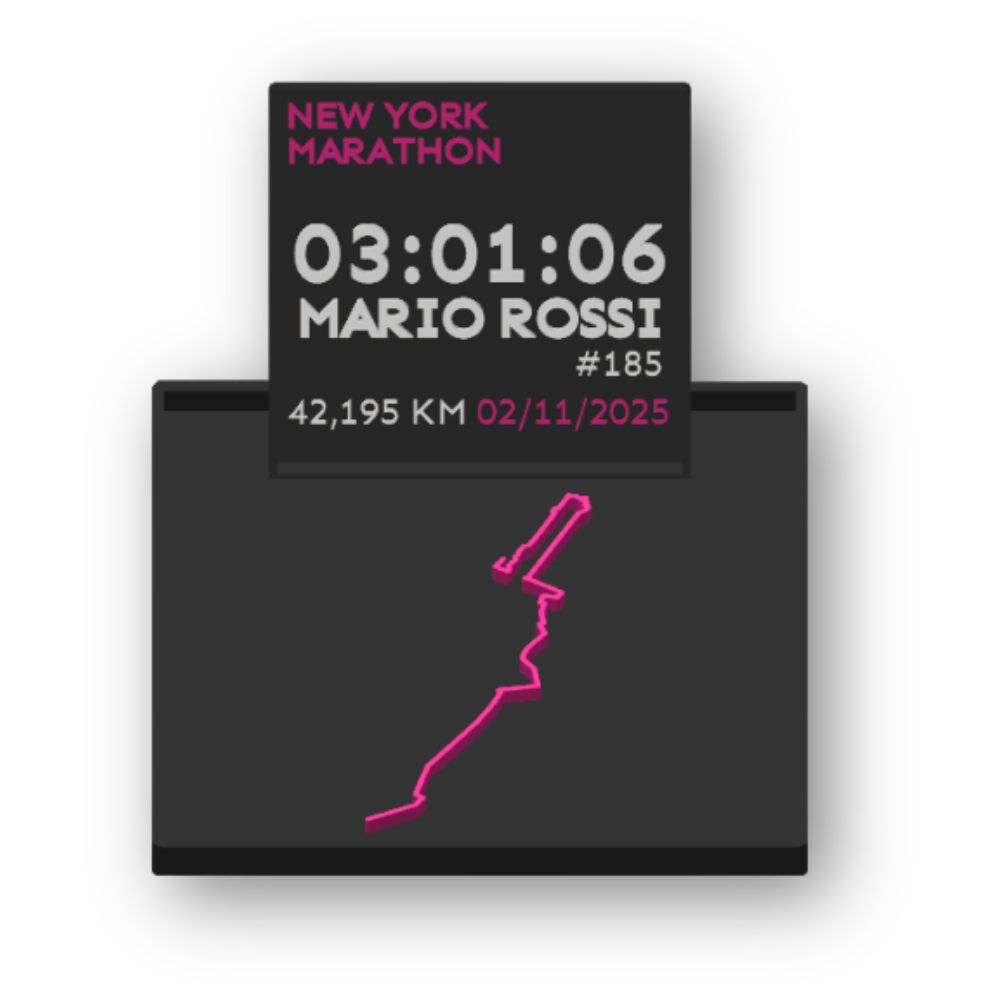 Un prodotto unico dedicato alla Maratona di New York, modellato e stampato in 3D, che trasforma il tuo percorso di gara in un oggetto di design da esporre con orgoglio. Sulla cornice vengono mostrati tempo finale, nome, numero di pettorale e data dell’evento, tutti personalizzabili dal runner.