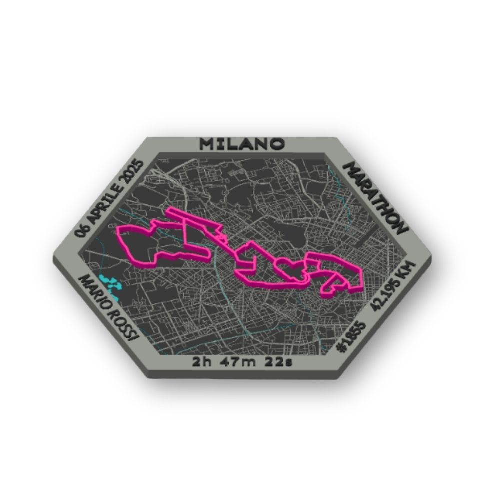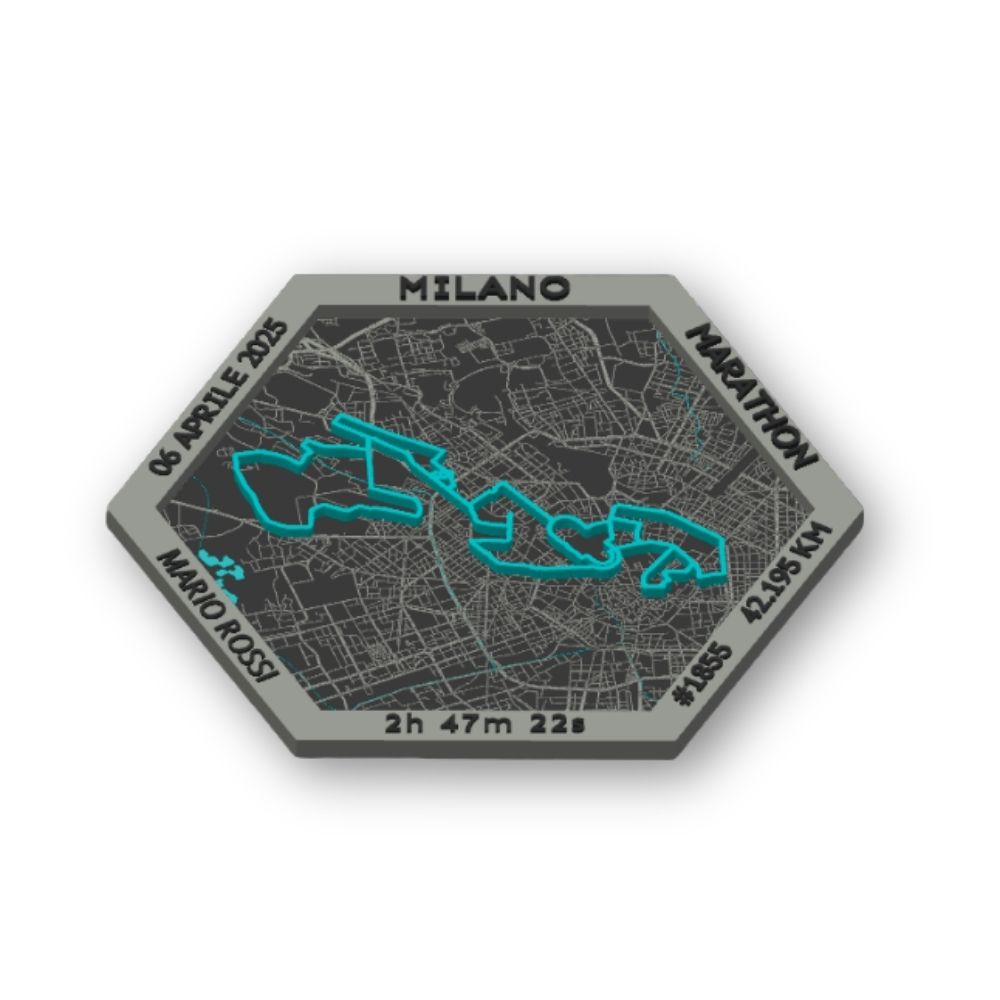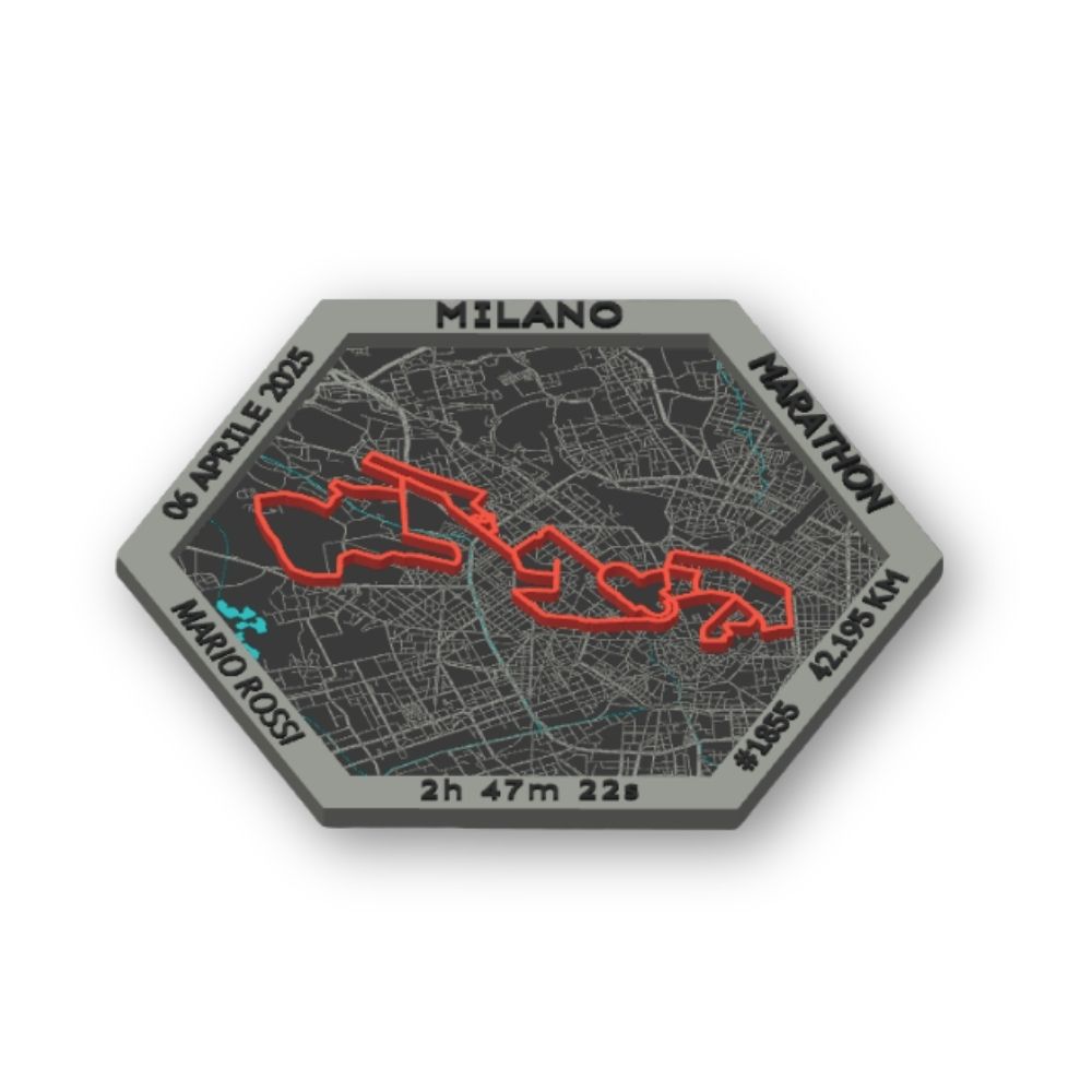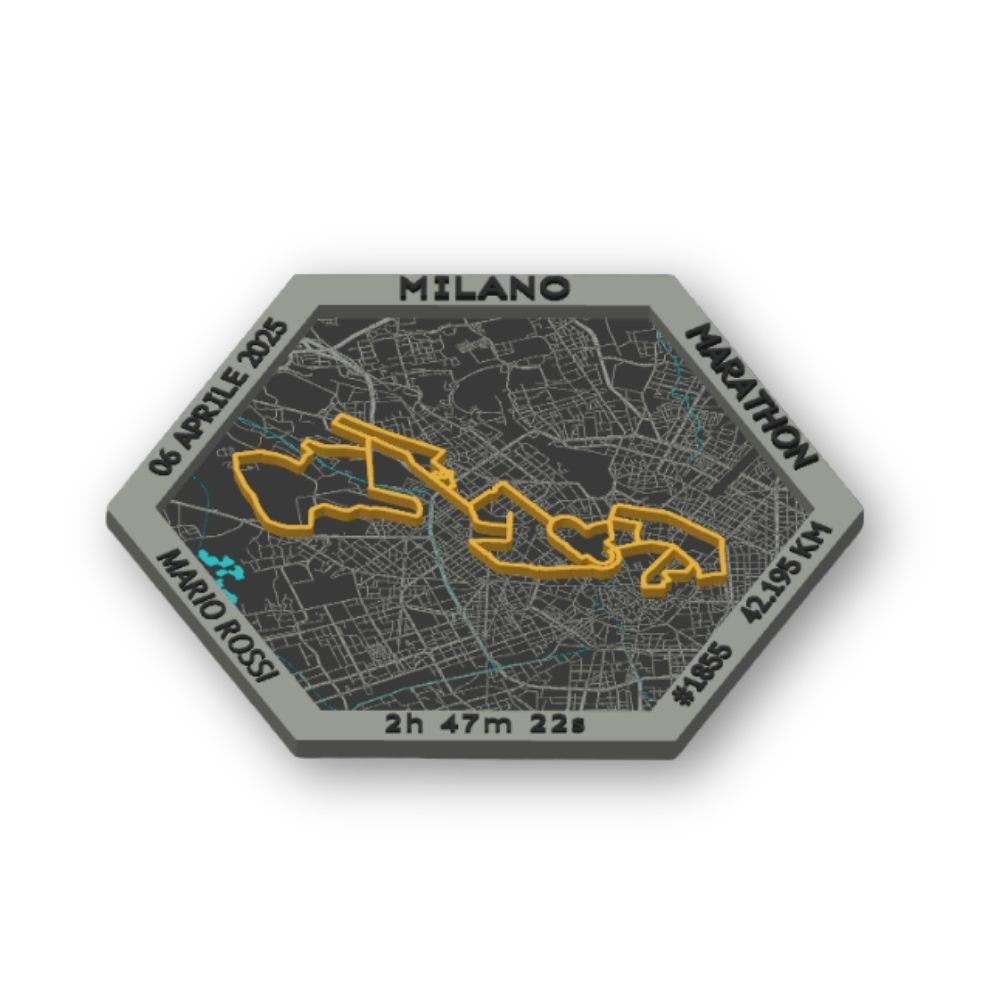 Un prodotto unico dedicato alla Maratona di MILANO, modellato e stampato in 3D, che trasforma il tuo percorso di gara in un oggetto di design da esporre con orgoglio. Sulla cornice vengono mostrati tempo finale, nome, numero di pettorale e data dell’evento, tutti personalizzabili dal runner.