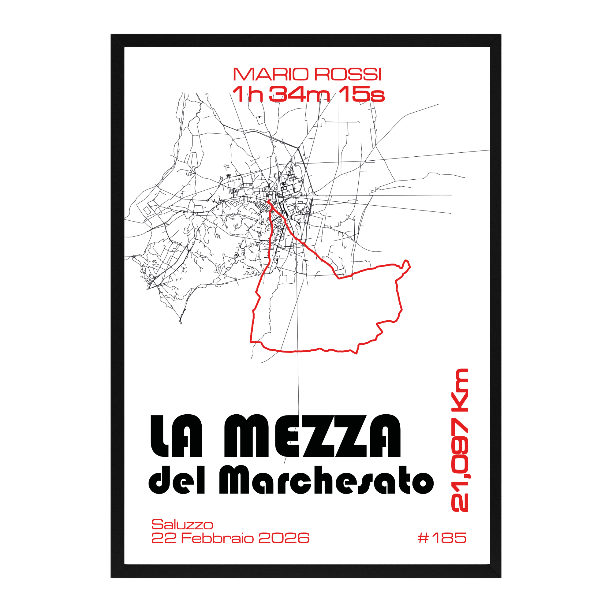 Un prodotto unico dedicato alla La Mezza del Marchesato, modellato e stampato in 3D, che trasforma il tuo percorso di gara in un oggetto di design da esporre con orgoglio. Sulla targhetta vengono mostrati il tempo finale, nome, numero di pettorale e data dell’evento, tutti personalizzabili dal runner.